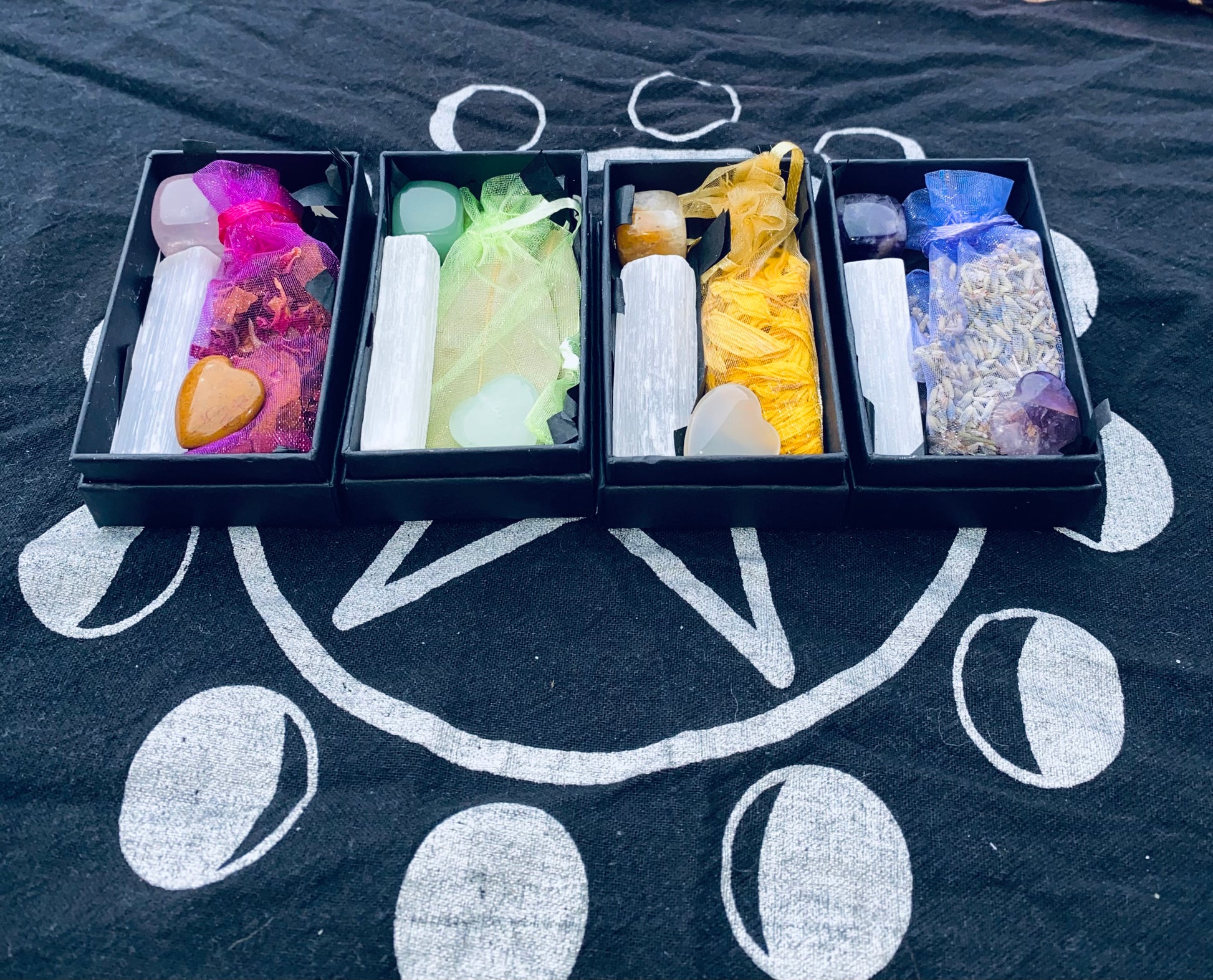 All our gift boxes come with selenite, a cube tumble and a crystal heart; as well as a herb or flower bag.