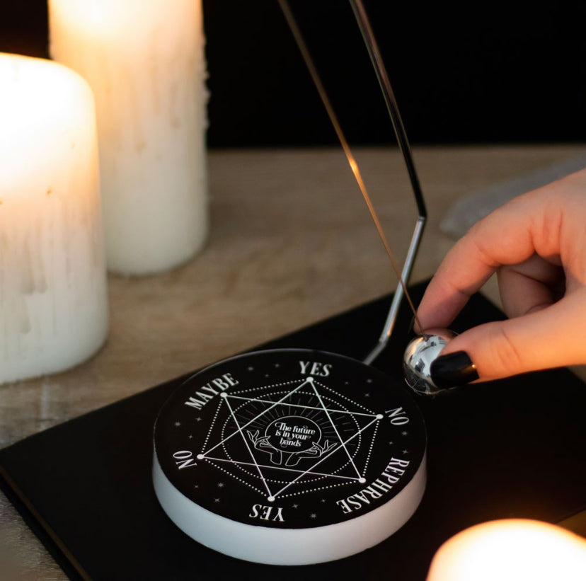 A viral trend on TikTok and other social media, this metal decision maker features a spherical pendulum that magically selects one of six responses. Simply ask your desired 'yes' or 'no' question and watch as the pendulum cycles through the possible outcomes and lands on your destiny. Perfect in size for keeping on desktops and side tables for quick decision-making.