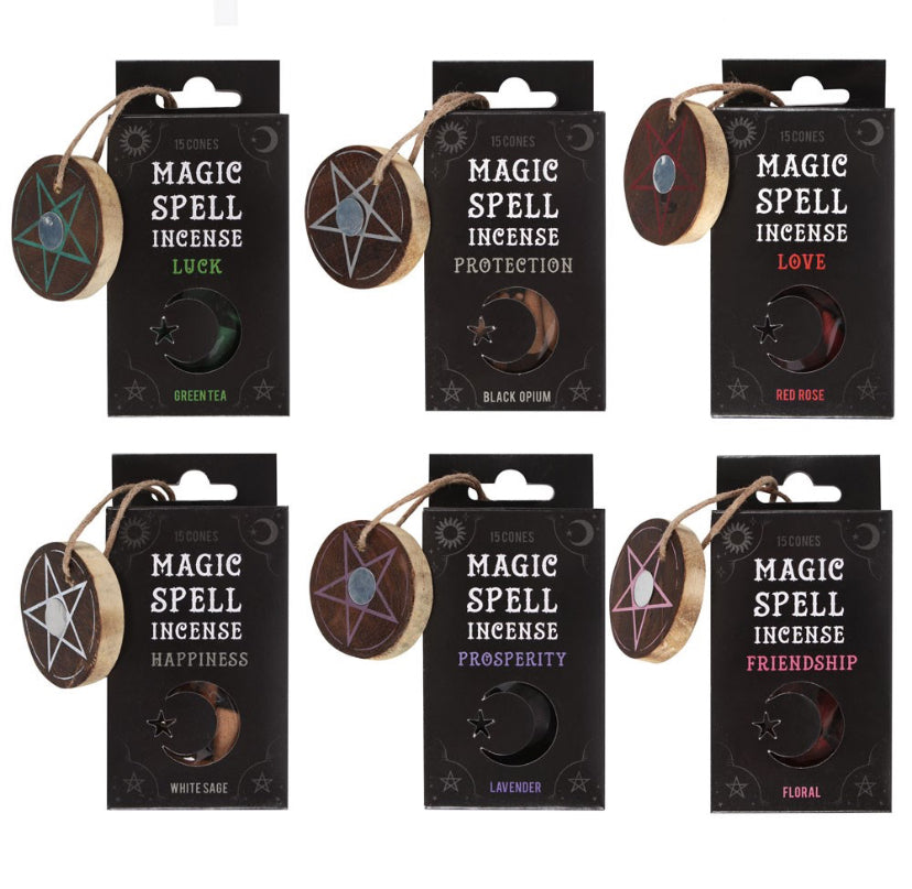 magic spell incense cones with matching incense holders. Fragrances include; Protection (black opium), Prosperity (lavender), Happiness (white sage), Love (red rose), Luck (green tea)and Friendship (floral).