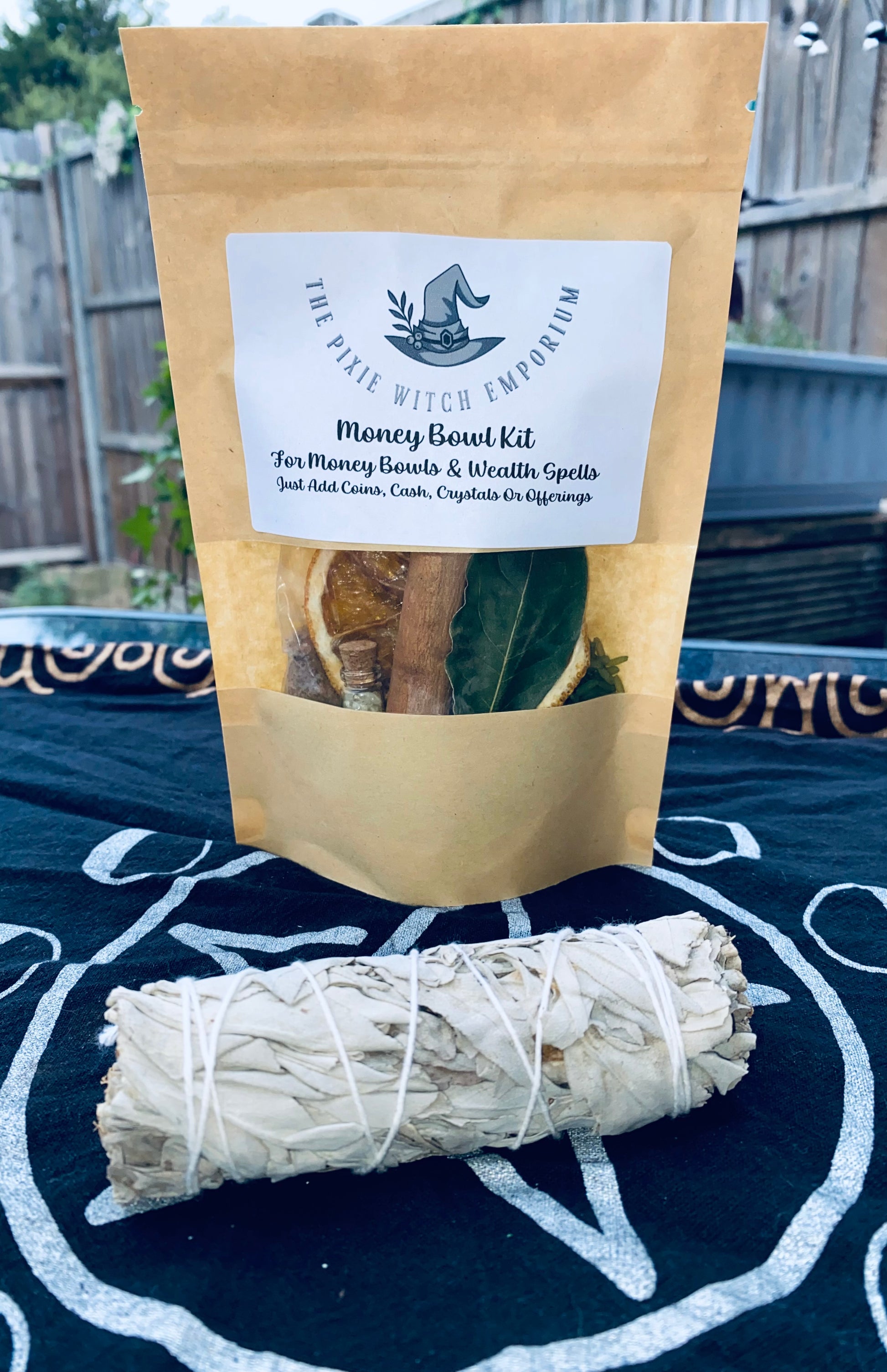 Green money rice, Himalayan salt, cinnamon sticks, bay leaves, dried orange, an abundance herb mix & citrine chips.
