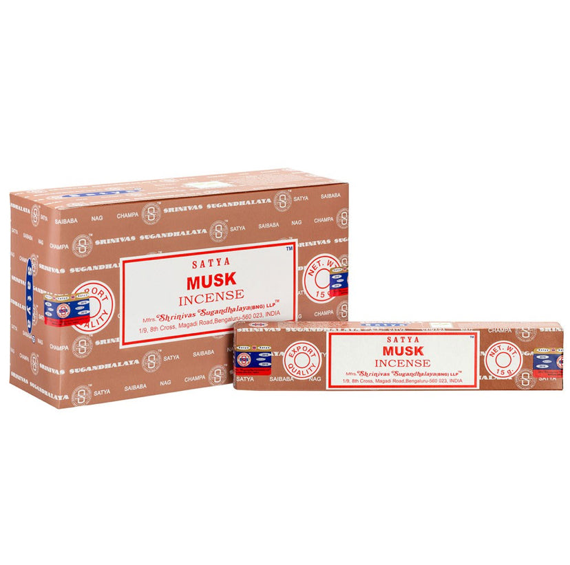 Satya Musk incense sticks. Satya incense are handmade by artisans in India using the highest quality ingredients. Each inner pack contains 10-12 vegan friendly incense sticks