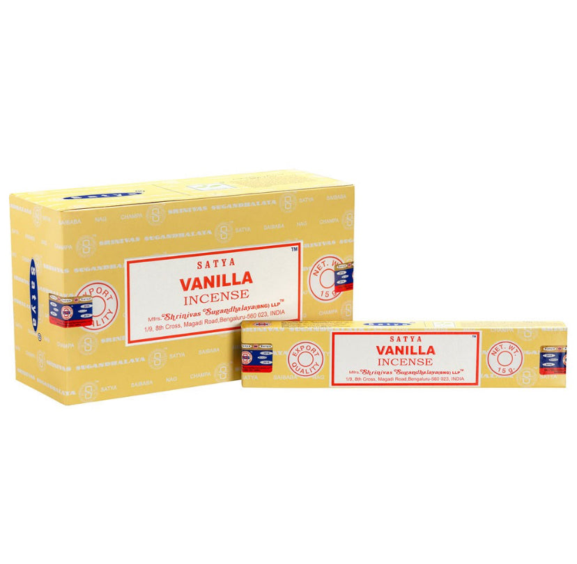 Satya Vanilla incense sticks. This sweet scent is said to brighten dull moods and is perfect for parties and gatherings. Satya incense are handmade by artisans in India using the highest quality ingredients. Each inner pack contains 10-12 vegan friendly incense sticks.
